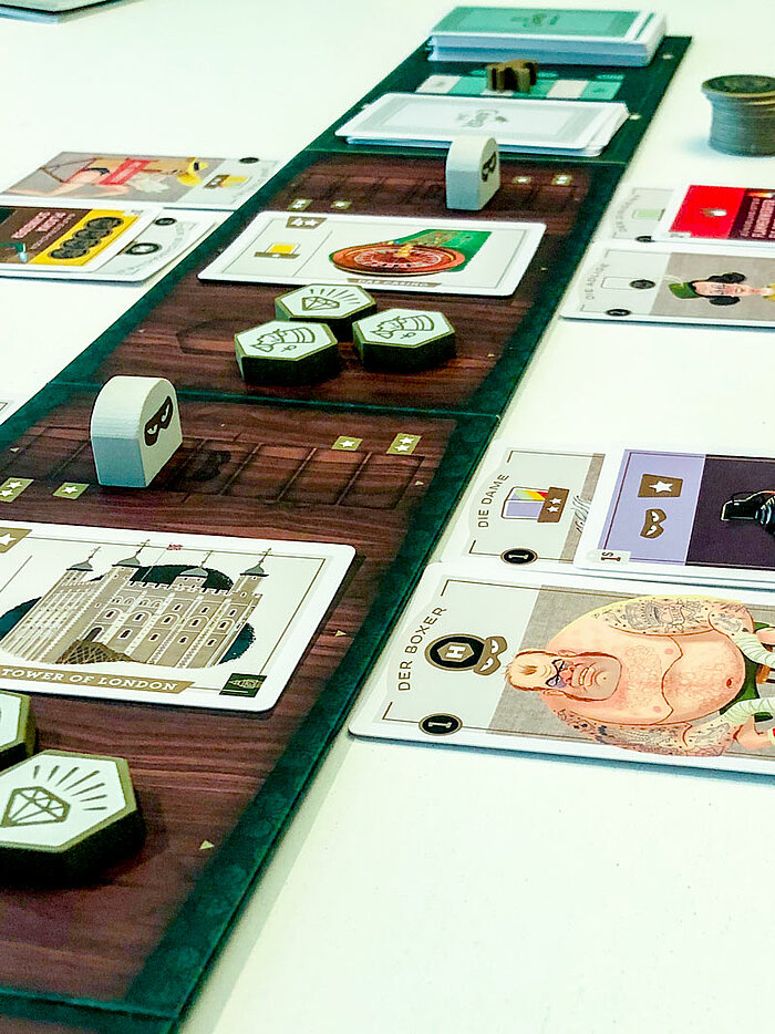Schlüpft in die Rolle von kriminellen Genies, heuert Diebesbanden an und stattet sie mit der richtigen Ausrüstung aus. In den vier größten Metropolen Europas (London, Rom, Paris und Barcelona) plant ihr lukrative Raubzüge. Jede Stadt bietet verschiedene Schwerpunkte und ihr könnt dort die entsprechenden Spezialisten anheuern. Versucht mit euren abgelegten Karten geschickt Kombinationen zu bilden. Dabei müsst ihr die Machenschaften eures Gegenübers genau im Auge behalten. Denn nach jeder Runde, in der ihr beide eine Karte gespielt habt, tauscht ihr eure Handkarten.