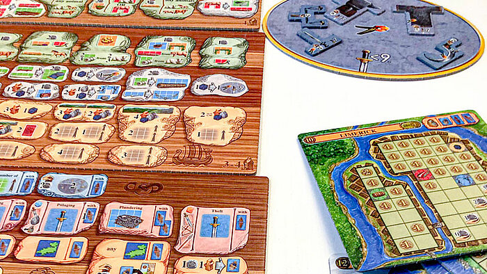 - Modularer Spielplan: Der neue Spielplan ist dreigeteilt und die Anzahl der Aktionsfelder auf der Vorder- und Rückseite ist an die Spielerzahl angepasst. D. h., die Auswahl an Aktionen lässt sich nun für kleinere Spielerzahlen beschränken. Außerdem gibt es eine neue 5. Spalte für den „letzten Wikinger“ bzw. die letzte Aktion, die man in einer Runde tätigt.