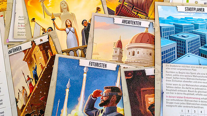 Alle Zivilisationstableaus des großen Entwicklungsspieles in endgültiger Form.