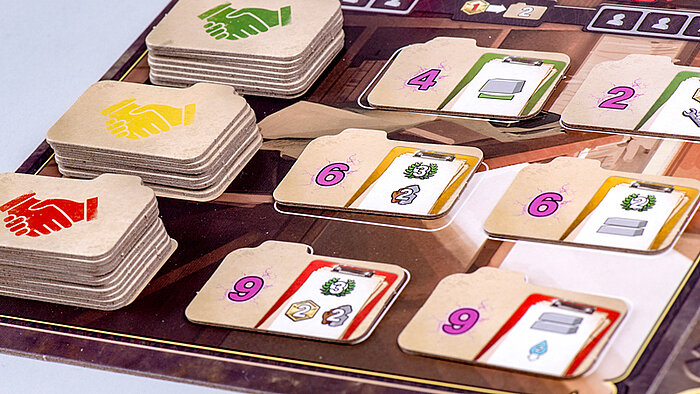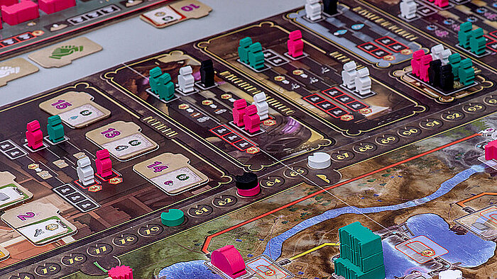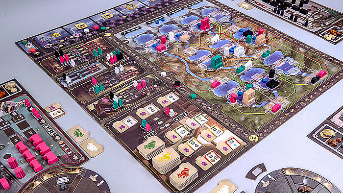 Nur mit planvollem Vorgehen kannst du dir den Zugang zum wichtigsten Rohstoff des Spiels sichern: Wasser. Pass auf, dass deine Mitspieler es dir nicht abgraben.