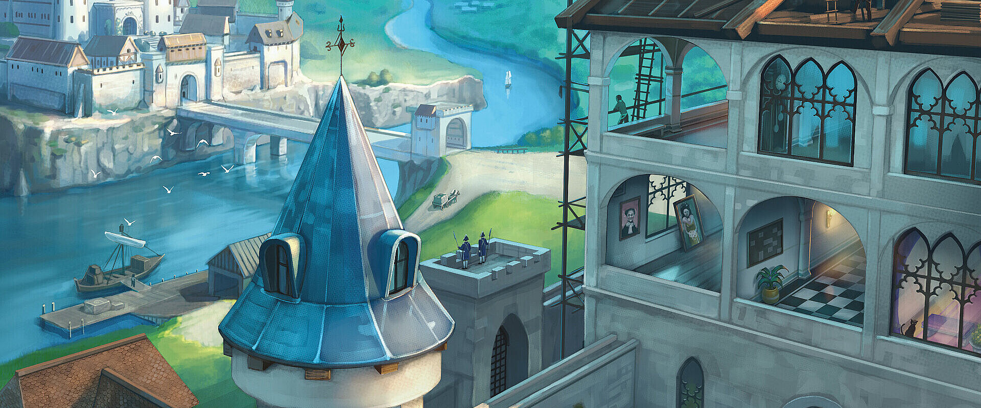 Bis zu 7 Spieler bauen gleichzeitig und gemeinsam mit ihren rechten und linken Nachbarn ein Schloss. Da am Ende für jeden Spieler nur das Schloss mit der geringeren Punktzahl gewertet wird, darf keins der beiden vernachlässigt werden! Mit Glück und Geschick entstehen aus den über 200 Raumplättchen jedesmal neue Bauwerke.